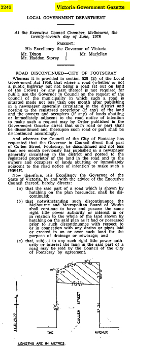 The Victoria Government Gazette No. 61, dated 5 July 1978 contains a formal notice under Section 528(2) of the Local Government Act 1958, discontinuing the road known as Cullen Street (now 7 Cullen Court). This document explicitly confirms the land was no longer needed for transport purposes and was offered for sale by the City of Footscray. Our title, vested by Instrument H323270, confirms the legal transfer into private ownership on 29 November 1978.