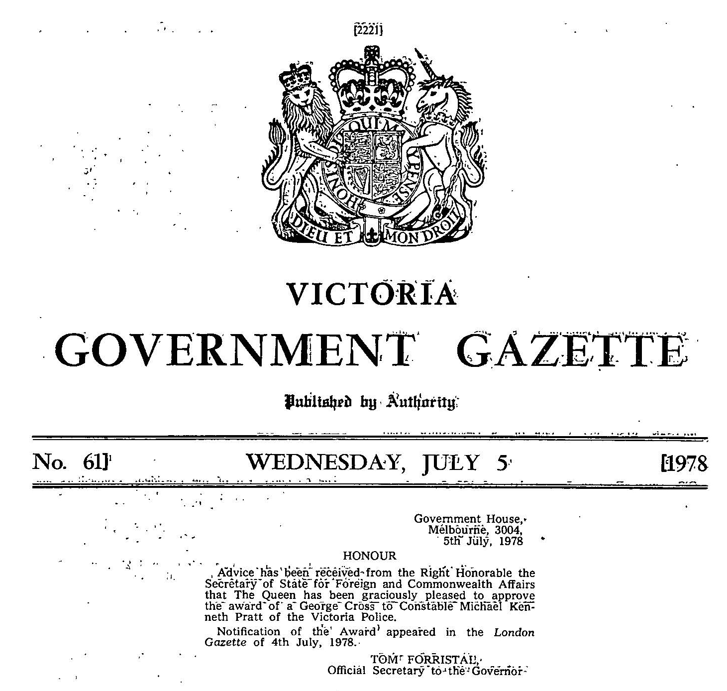 A notarized copy of the 1978 gazette legal document notarized by a barrister and solicitor of the Supreme Court of Victoria and of the High Court of Australia is available here: